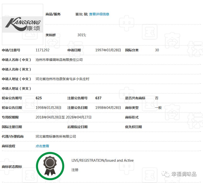 幸福調(diào)味品自創(chuàng)辦30多年以來(lái),在工商部門指導(dǎo)下,充分認(rèn)識(shí)到商標(biāo)品牌的重要性,始終堅(jiān)持走創(chuàng)品牌的路子。公司的“康頌”商標(biāo)于1997年在30類,糖、茶、糕點(diǎn)、調(diào)味品類獲核準(zhǔn)注冊(cè)后,并根據(jù)市場(chǎng)需要,先后又注冊(cè)了包括“滄獅”中文及拼音在內(nèi)的等商標(biāo);形成了涵蓋多類別、多商品、多層次的商標(biāo)品牌庫(kù)。